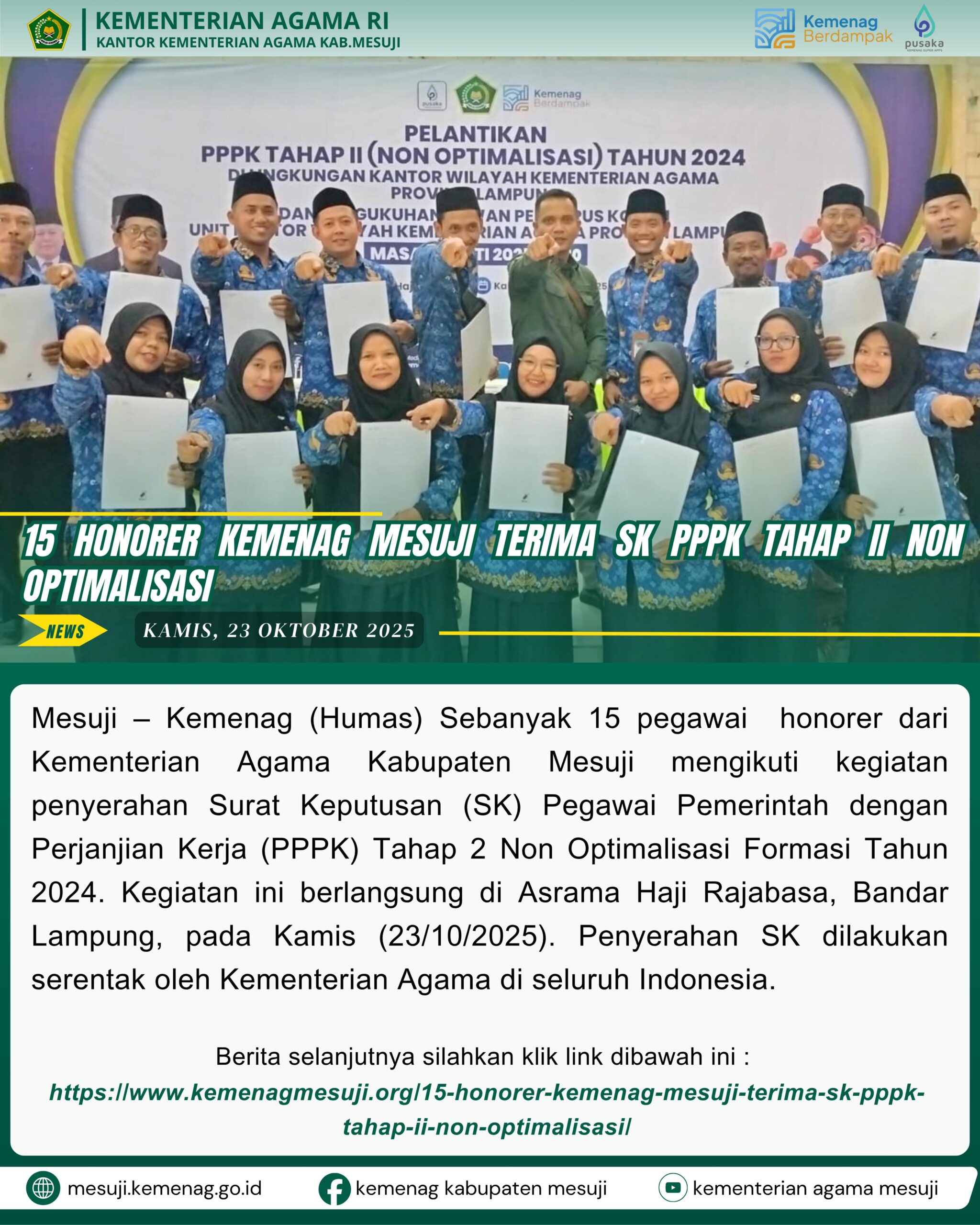 Mesuji – Kemenag (Humas) Sebanyak 15 pegawai Honorer dari Kementerian Agama Kabupaten Mesuji mengikuti kegiatan penyerahan Surat Keputusan (SK) Pegawai Pemerintah dengan Perjanjian Kerja (PPPK) Tahap 2 Non Optimalisasi Formasi Tahun 2024. Kegiatan ini berlangsung di Asrama Haji Rajabasa, Bandar Lampung, pada Kamis (23/10/2025). Penyerahan SK dilakukan serentak oleh Kementerian Agama di seluruh Indonesia.