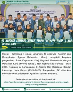 Mesuji – Kemenag (Humas) Sebanyak 15 pegawai Honorer dari Kementerian Agama Kabupaten Mesuji mengikuti kegiatan penyerahan Surat Keputusan (SK) Pegawai…
