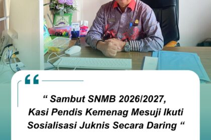 Mesuji, Kemenag (Humas) — Kementerian Agama Kabupaten Mesuji melalui Kepala Seksi Pendidikan Islam (Pendis), Gusdianto, mengikuti kegiatan Sosialisasi Petunjuk Teknis Seleksi Nasional Murid Baru (SNMB...
