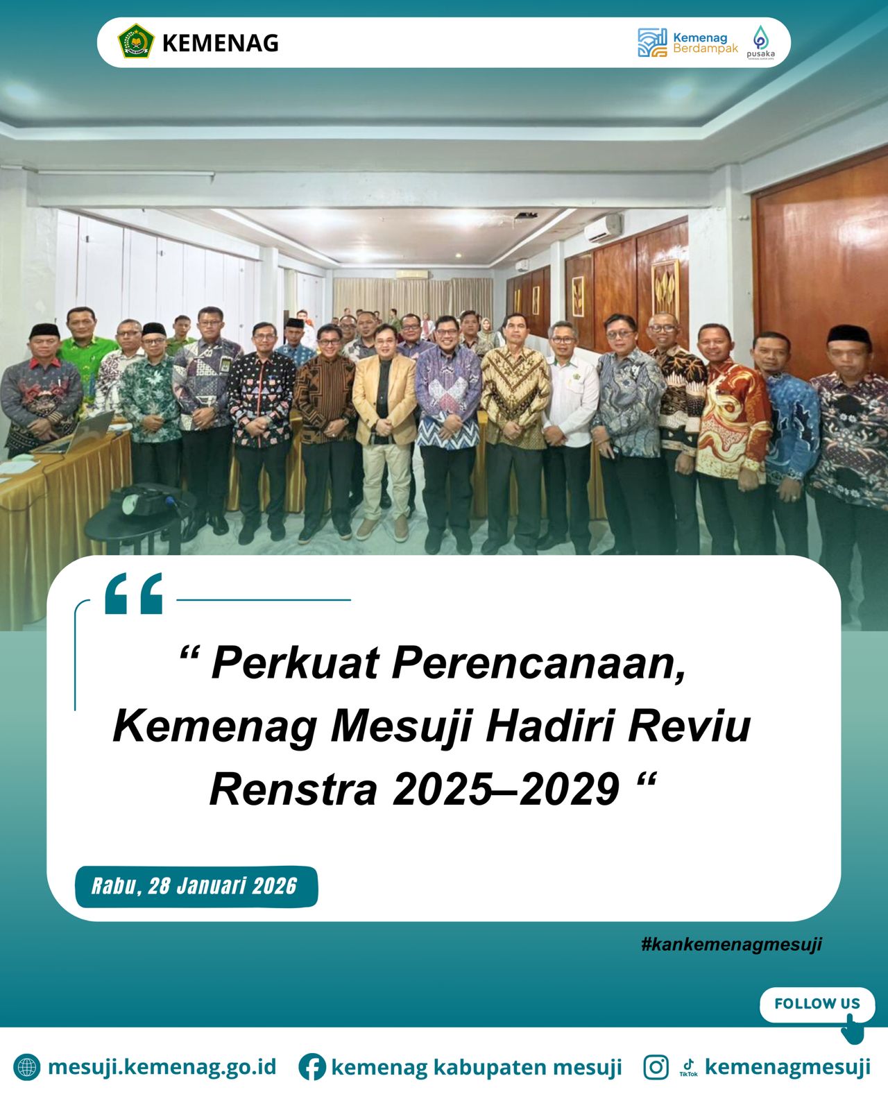 Melalui kegiatan Reviu Renstra ini, Kementerian Agama Kabupaten Mesuji berkomitmen untuk terus meningkatkan profesionalisme dan kinerja kelembagaan. Penyusunan Renstra yang kolaboratif diharapkan mampu menjawab tantangan pelayanan keagamaan dan pendidikan keagamaan ke depan. Dengan perencanaan yang kuat, Kementerian Agama diharapkan semakin hadir dan dirasakan manfaatnya oleh masyarakat. (mut/da)