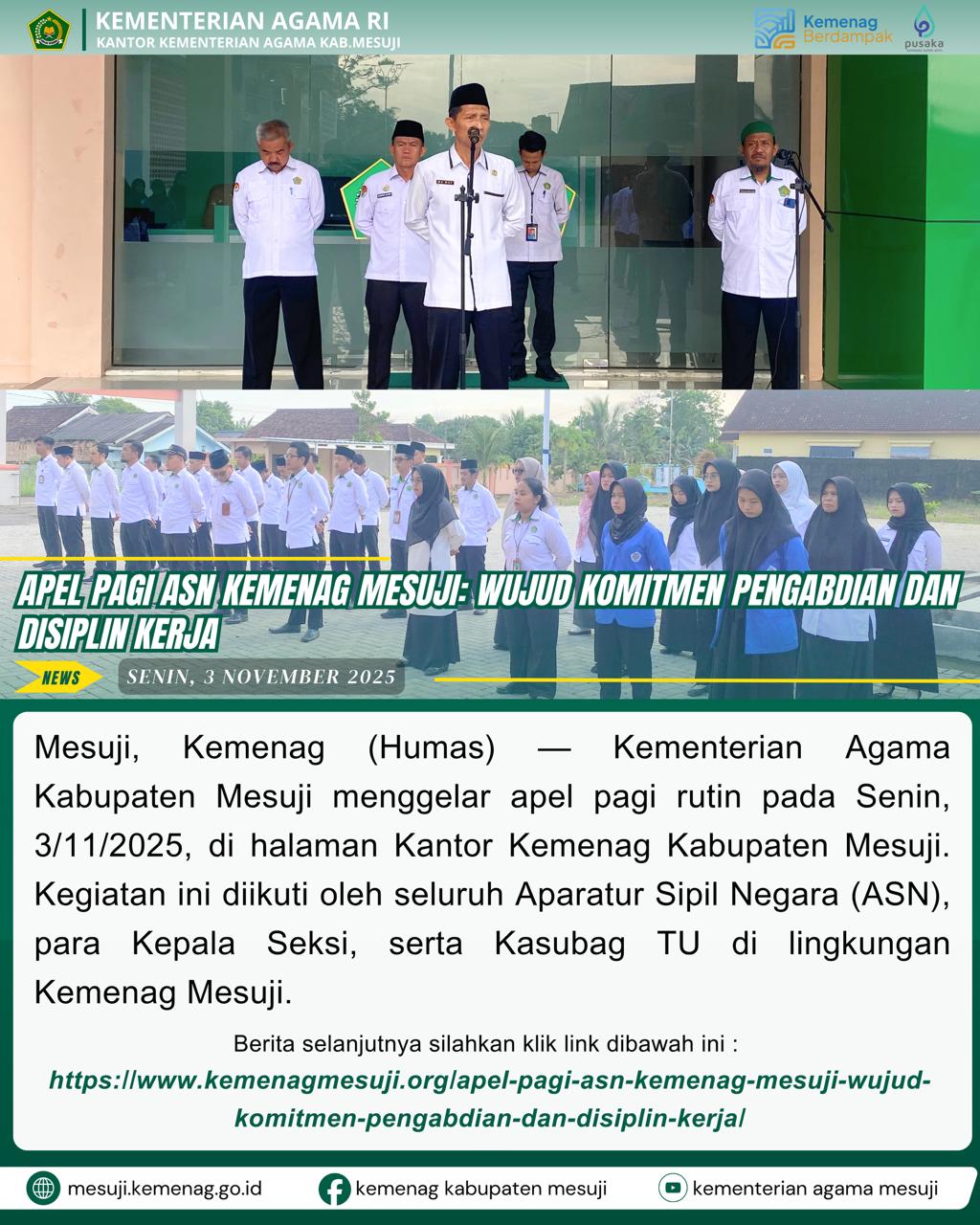 Kemenag Mesuji berkomitmen untuk terus menumbuhkan budaya kerja yang berorientasi pada pelayanan publik yang berkualitas. Melalui kegiatan apel pagi, setiap ASN diingatkan kembali akan tanggung jawabnya sebagai pelayan masyarakat yang harus bekerja dengan penuh keikhlasan dan tanggung jawab. Budaya apel ini diharapkan dapat menjadi pengingat moral untuk bekerja dengan hati. (mut/m)