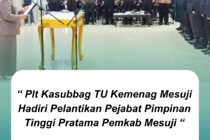 Mesuji, Kemenag (Humas) – Kementerian Agama Kabupaten Mesuji melalui Plt Kasubag TU Kemenag Mesuji, Darul Alipi, menghadiri kegiatan pelantikan dan pengukuhan Pejabat Pimpinan Tinggi Pratama di lingku...