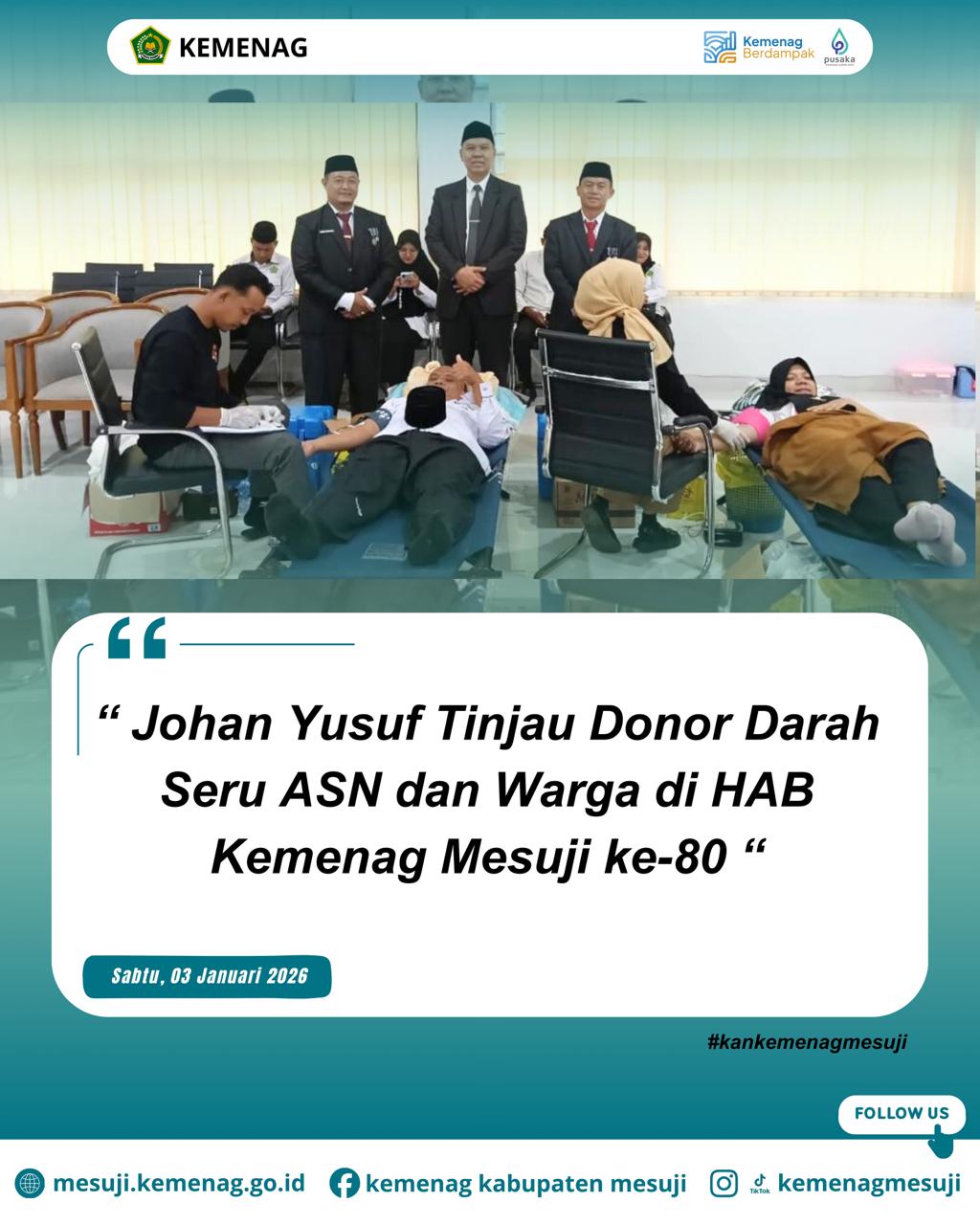 Kegiatan ini merupakan inisiatif Kemenag Mesuji untuk memperingati 80 tahun perjalanan Kementerian Agama. Selain donor darah, rangkaian HAB mencakup upacara, penganugerahan Satyalancana Karya Satya, dan rapat kerja DWP Kemenag Mesuji. Johan Yusuf menekankan pentingnya gaya hidup sehat dan kepedulian sosial. “Mari jadikan HAB sebagai momentum untuk terus berbakti. Donor darah ini bukti bahwa agama hadir sebagai solusi bagi masalah kemanusiaan,” pesan Johan kepada para pendonor.
