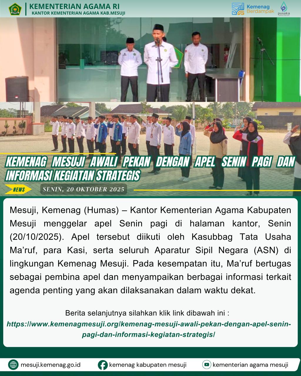 Mesuji, Kemenag (Humas) – Kantor Kementerian Agama Kabupaten Mesuji menggelar apel Senin pagi di halaman kantor, Senin (20/10/2025). Apel tersebut diikuti oleh Kasubbag Tata Usaha Ma’ruf, para Kasi, serta seluruh Aparatur Sipil Negara (ASN) di lingkungan Kemenag Mesuji. Pada kesempatan itu, Ma’ruf bertugas sebagai pembina apel dan menyampaikan berbagai informasi terkait agenda penting yang akan dilaksanakan dalam waktu dekat.