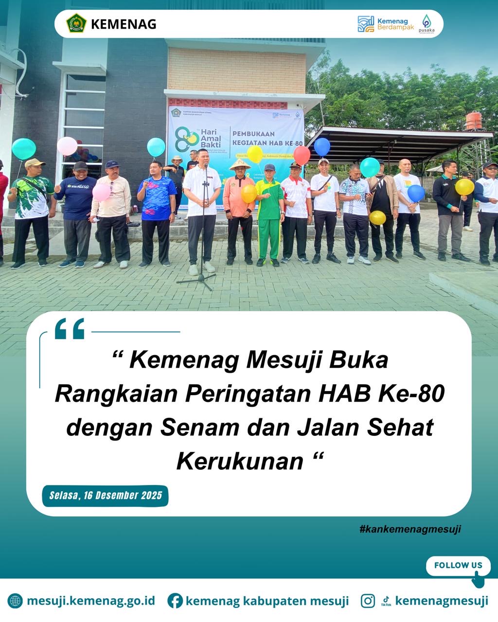 Pembukaan HAB ke-80 resmi dibuka langsung oleh Kepala Kantor Kementerian Agama Kabupaten Mesuji, Johan Yusuf, dengan ditandai pelepasan balon bersama. Ia hadir bersama jajaran pejabat struktural dan fungsional Kemenag Mesuji. Kegiatan ini diselenggarakan sebagai bentuk syukur atas perjalanan panjang Kementerian Agama dalam melayani umat dan menjaga kerukunan.