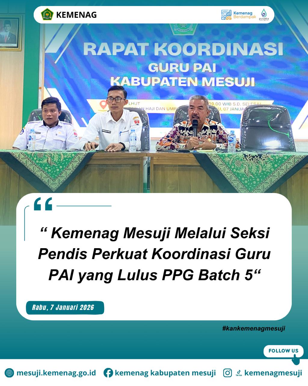 Melalui rapat koordinasi ini, Kementerian Agama Kabupaten Mesuji berharap terwujud kesamaan pemahaman dan peningkatan kualitas layanan pendidikan agama Islam. Kegiatan ini juga menjadi wujud komitmen Kemenag dalam mendukung profesionalisme guru PAI. Dengan koordinasi yang berkelanjutan, diharapkan pelaksanaan program PPG dapat berjalan optimal dan tepat sasaran.(mut/f/g)