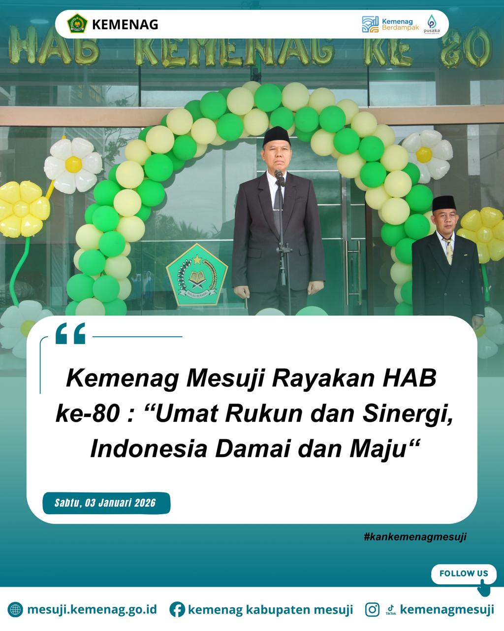 Mesuji, Kemenag (Humas) – Kantor Kementerian Agama Kabupaten Mesuji menggelar Upacara Peringatan Hari Amal Bakti (HAB) ke-80 Kementerian Agama Republik Indonesia pada Sabtu (3/1/2026). Acara berlangsung khidmat di halaman kantor Kemenag setempat, dihadiri ratusan peserta dari lingkungan internal dan tamu undangan.