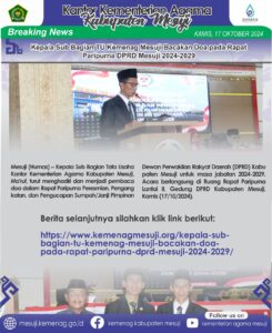 Mesuji (Humas) – Kepala Sub Bagian Tata Usaha Kantor Kementerian Agama Kabupaten Mesuji, Ma’ruf, turut menghadiri dan menjadi pembaca doa dalam Rapat Paripurna Peresmian, Pengangkatan, dan Pengucapan Sumpah/Janji Pimpinan Dewan Perwakilan Rakyat Daerah (DPRD) Kabupaten Mesuji untuk masa jabatan 2024-2029. Acara berlangsung di Ruang Rapat Paripurna Lantai II, Gedung DPRD Kabupaten Mesuji, Kamis (17/10/2024).