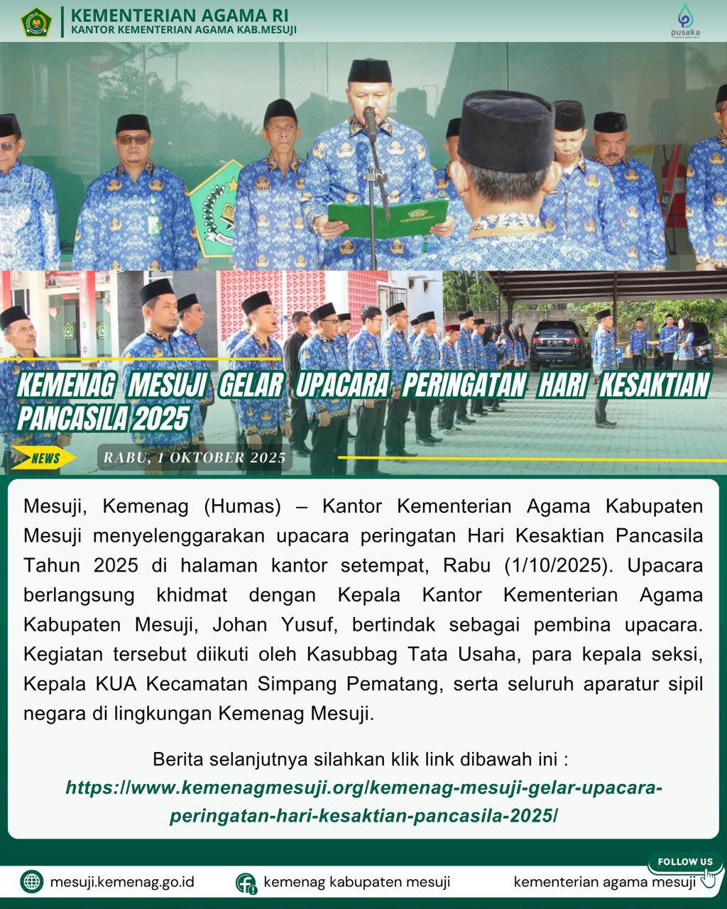 Mesuji (Humas) – Kasubbag Tata Usaha Kantor Kementerian Agama Kabupaten Mesuji Ma’ruf menjadi Pembina Apel rutin, yang diikuti oleh Seluruh…
