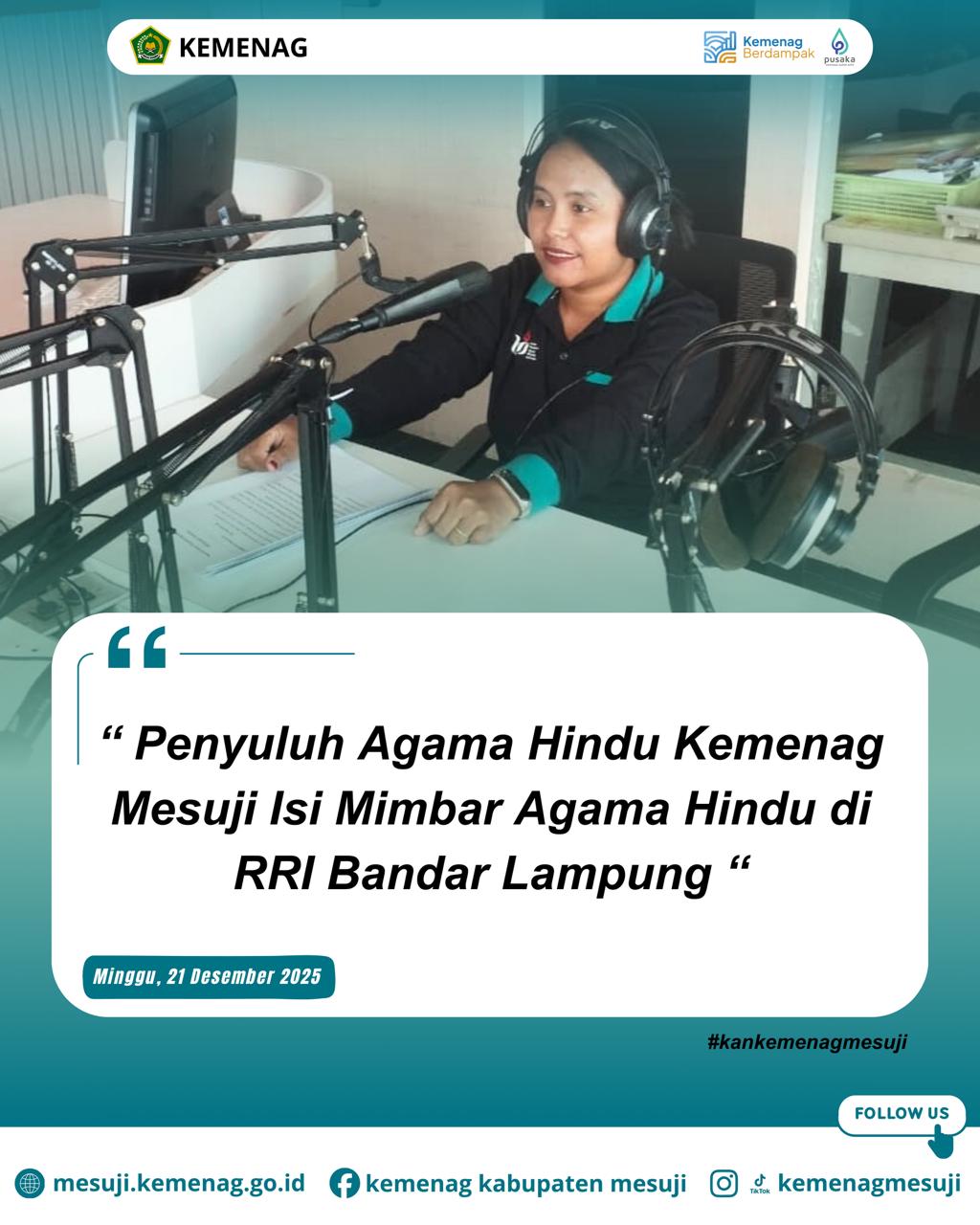 Mesuji, Kemenag (Humas) – Penyuluh Agama Hindu Kemenag Kabupaten Mesuji, Ni Ketut Putriani, melaksanakan kegiatan Mimbar Agama Hindu di Radio Republik Indonesia (RRI) Bandar Lampung, Minggu (21/12/2025). Kegiatan ini mengangkat tema “Menjadi Hindu yang Teguh di Tengah Perubahan Zaman”. Siaran tersebut merupakan bagian dari upaya pembinaan dan penguatan keagamaan bagi umat Hindu.