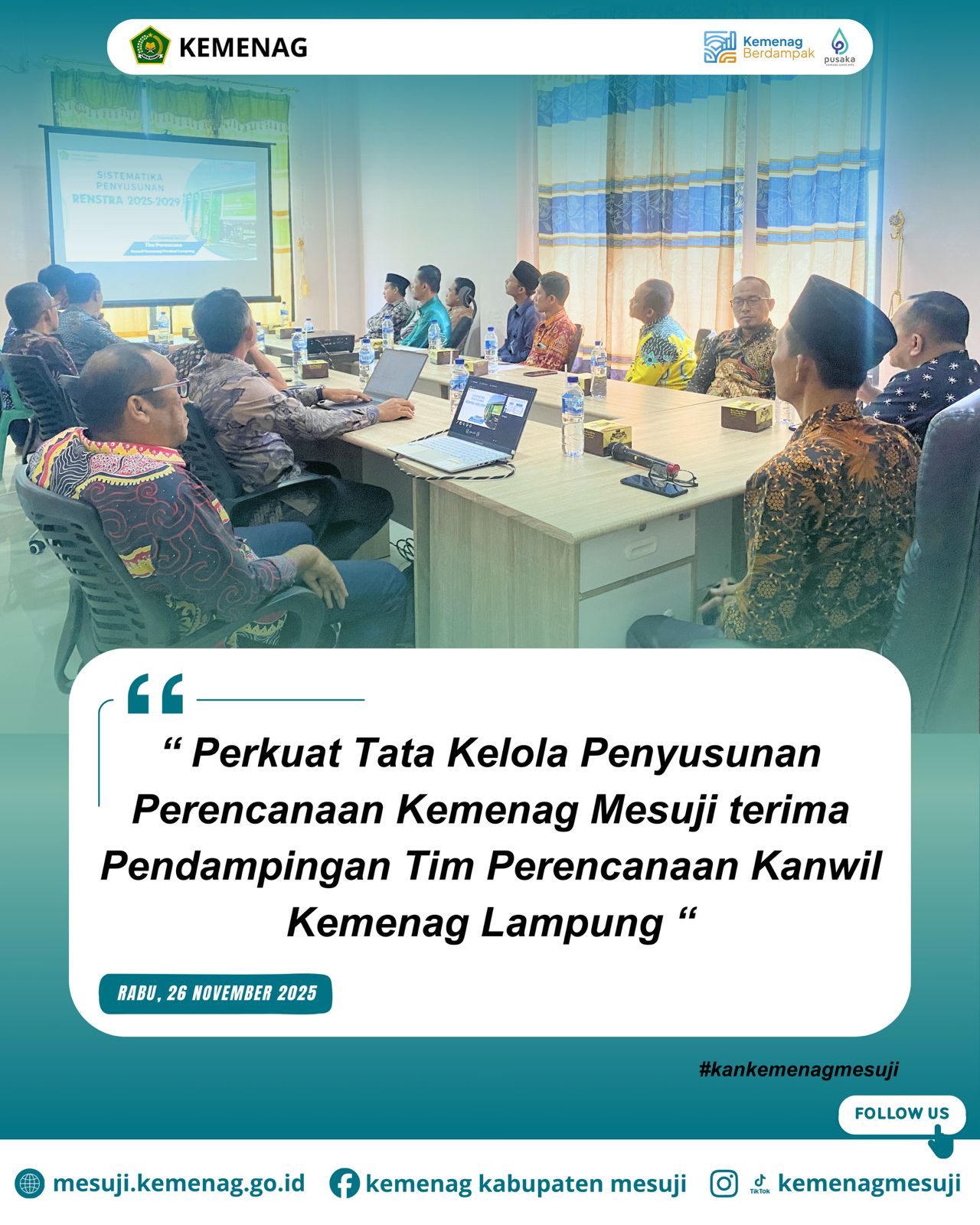 Mesuji, Kemenag (Humas) – Kementerian Agama Kabupaten Mesuji terima pendampingan penyusunan rencana kerja dan rencana strategis dari tim perencana Kantor Wilayah Kementerian Agama Provinsi Lampung pada Rabu (26/11/2025). Kegiatan berlangsung di ruang rapat Kantor Kemenag Mesuji. Kegiatan tersebut juga membahas alokasi belanja tambahan (ABT) belanja pegawai tahun anggaran 2025. Kegiatan berlangsung di ruang rapat Kantor Kemenag Mesuji.