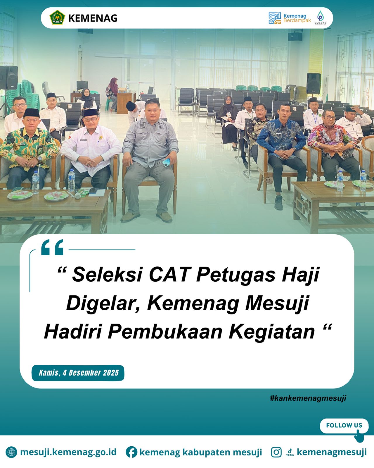 Mesuji, Kemenag (Humas) – Kementerian Agama Kabupaten Mesuji melalui Plt. Kasubbag TU, Darul Alipi, menghadiri pembukaan seleksi Computer Assisted Test (CAT) Petugas Haji di Kantor Kementerian Haji dan Umrah Kabupaten Mesuji pada Kamis (4/12/2025). Kegiatan tersebut digelar sebagai bagian dari tahapan rekrutmen petugas haji.