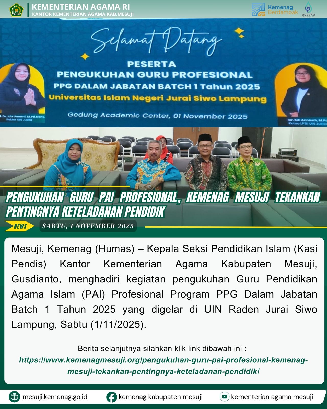 Mesuji (Humas) – Pengawas Pembina Madrasah Kantor Kementerian Agama Kabupaten Mesuji, Rohman, mendampingi Tim Asesor dari Bidang Pendidikan Madrasah (Penmad) Kantor Wilayah Kementerian Agama Provinsi Lampung dalam kegiatan Penilaian Kinerja Kepala Madrasah (PKKM) di MAN 1 Mesuji, Selasa (10/12/2024). Tim asesor ini diketuai oleh Roswidan, bersama anggota tim lainnya.